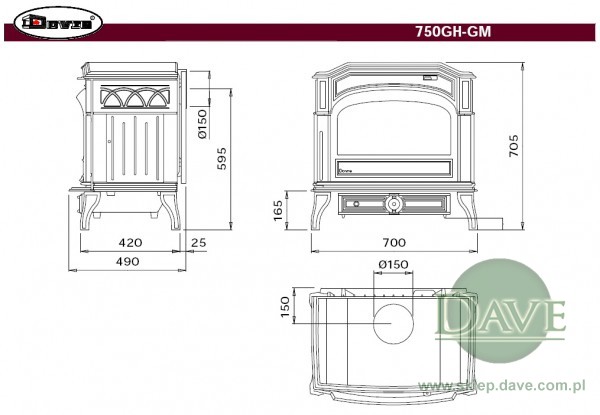 - Podłączenie do przewodu kominowego: 150 mm (góra lub tyĹ‚ piecyka)