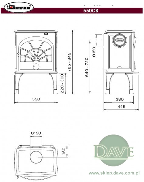 - Podłączenie do przewodu kominowego: 150 mm (góra, bok lub tyĹ‚ piecyka)