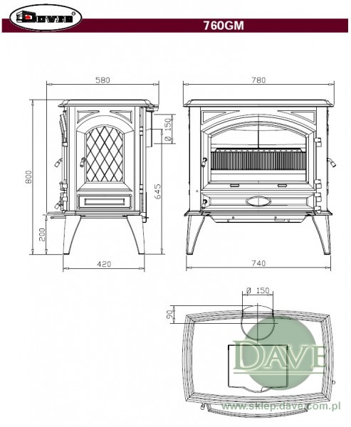 - Podłączenie do przewodu kominowego: 150 mm (góra lub tyĹ‚ piecyka)
